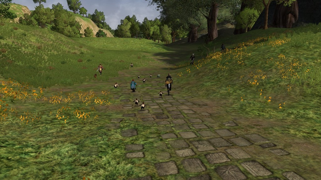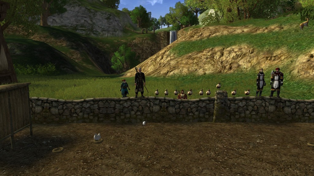 Mit reichlich Hühnern und einem Geleitschutz ging es nach Bruchtal. Natürlich wurde auf dem Weg dorthin mal wieder Bree eingenommen. Die Rollenspieler vor dem Tänzelnden Pony wurden von den gackernden Hühnern überrascht. Zur Feier unseres Sieges ließen wir uns dort sogar füttern. Die Hühner natürlich...^^