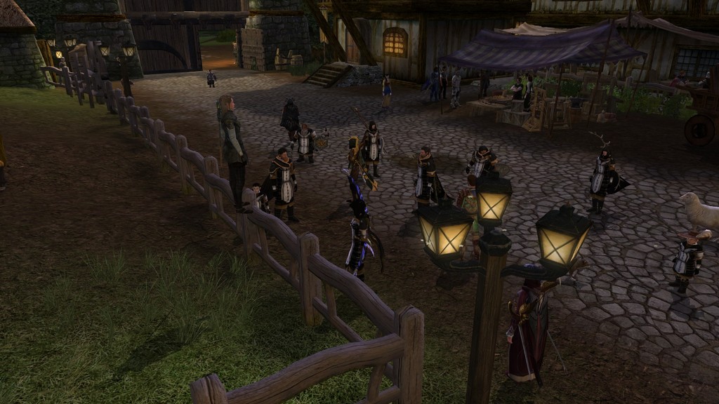 Zuerst trafen wir uns in unserem Sippenhaus in Wilster, um von dort gemeinsam nach Bree zu reisen. Nach einem kleinen Spaziergang versammelten wir uns von dem Auktionshaus am Südtor und hielten dort unsere Heerschau ab. Der Reihe nach stellte sich einer auf den Zaun und ließ sich von den anderen inspizieren. Im TS wurde dann besprochen, was an der Ausrüstung des Betreffenden verbessert werden könnte, sei es Schmuck, Rüstung, Waffen, egal was. Unsere Handwerker teilten sich anschließend die Aufträge untereinander auf, wer was verbessern könnte. Und so konnten einige Schattenklingen wieder optimal ausgerüstet werden.